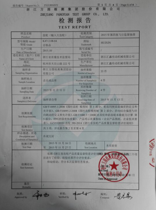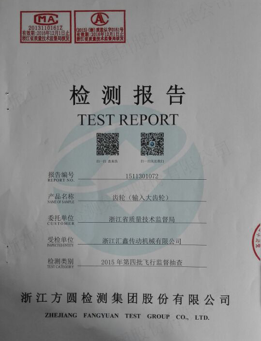 發布日期:[2016-01-04] 點擊率:浙江匯鑫傳動機械有限公司擁有著完善的檢測設備、先進的生產工藝、專業的制造技術、完善的質量管理體系、具有雄厚的研發技術實力。優良的減速機等傳動產品一直享有廣大用戶的認可和好評。產品質量不但通過IS09002質量體系標準認證,且在2015年12月通過了浙江省技術監督局的突擊抽查,雖然是突如其來的隨機抽查,但結論證明匯鑫產品的品質始終經得起考驗,所謂“內行看門道”,業界的有識之士更明白這一張張用數據說明的《檢測報告》其含金量,比華麗的品牌包裝更具有說服力,這代表著浙江匯鑫傳動機械有限公司的硬實力,更標志著匯鑫產品打造國內一流品牌的里程碑!